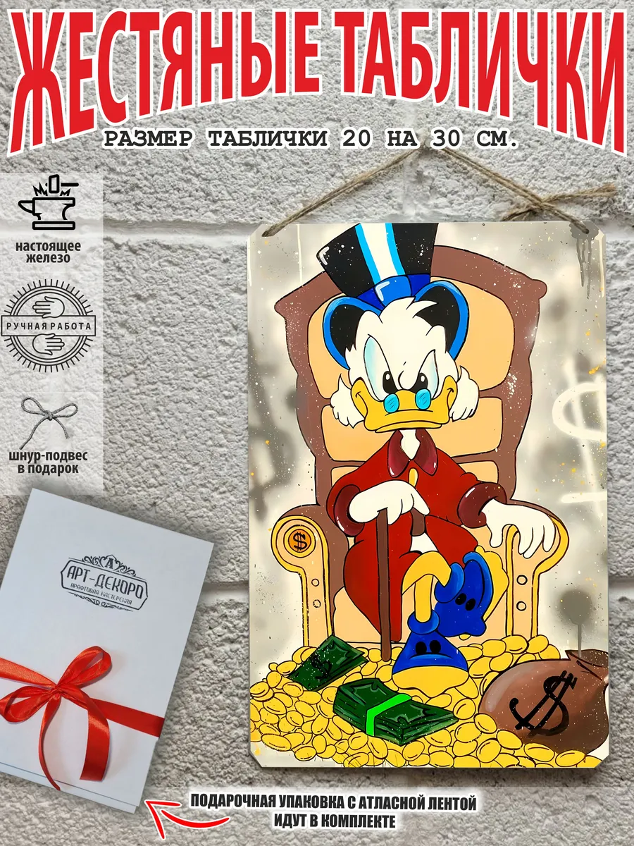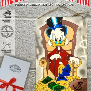Скрудж Макдак символизирует богатство, достигнутое благодаря упорному труду, целеустремлённости и предпринимательской хватке. Также он является символом предприимчивости, темперамента и умения выживать в реалиях американской мультипликации и комиксов. Некоторые цитаты Скруджа Макдака про деньги: «Там, где вы видите старый сарай, я вижу дело с оборотом в миллион долларов!». «Деньги нельзя откладывать, их нужно вкладывать». «Чёрт побери! Сейчас хороших костюмов не шьют, 30–40 лет — и они рвутся». Несмотря на свои миллионы, Скрудж покупал качественную одежду и обувь, которую можно носить десятилетиями. «Деньги больше помогут, когда нет удачи, чем удача, когда нет денег». «Дорогая, я, конечно, хотел купить тебе бриллиантовое кольцо, но ювелирные были закрыты, поэтому я купил тебе йогурт». Так Скрудж хотел сделать приятное своей возлюбленной. «За маленький кусочек золота можно получить очень-очень много денег… Ха-ха! И для игры в шашки оно очень подходит». «Экономить, конечно, надо, но при чём тут мой шоколад?». «Я самая богатая утка на земле, потому что не трачу своих денег». Скрудж любил пользоваться бесплатными возможностями, которые экономили его деньги. Представляем вам стильные и эффектные жестяные таблички с изображением скруджа мак дака. Наши постеры деньги — жестяные таблички, выполнены из металла, который отличается высоким качеством и долговечностью. Размер 20×30 см позволяет легко вписать наши картины в любой интерьер, будь то кухня, гостиная, офис или кафе. Почему стоит выбрать наш постер для интерьера скрудж макдак? Яркие и насыщенные цвета не выгорают на солнце и делают ваше пространство выразительным и уникальным. Легкость в уходе: наши картины для интерьера, таблички на дверь и постеры на стену можно легко мыть. Они не боятся влаги, что позволяет использовать их как в помещениях, так и на улице. Удобные варианты крепления: табличка может быть установлена на саморезы, гвозди, кнопки, клейкую ленту, магниты или повешена на шнур из натурального джута, который идет в комплекте. Упаковка: каждая табличка аккуратно упакована в защитный пакет и дополнительно завернута в эко-картон, а также дополнительно в комплекте идет подарочная упаковка, атласная лента и открытка — что делает её отличным подарком на любой случай – от дня рождения до новоселья – готовый подарок. Мы гордимся тем, что предлагаем более 15 000 уникальных дизайнов, включая постеры на стену для интерьера, постер на заказ и прикольные металлические таблички, чтобы каждый мог найти что-то для себя. Наши постеры разделены на коллекции разных серий, что позволяет заказать несколько табличек в едином стиле и создать неповторимую композицию у вас дома, не упустите возможность сделать свой дом стильным – добавляйте товары в избранное, чтобы первыми узнавать о скидках и новинках! Создайте атмосферу уюта и стиля с нашими металлическими картинами и постерами для интерьера уже сегодня!