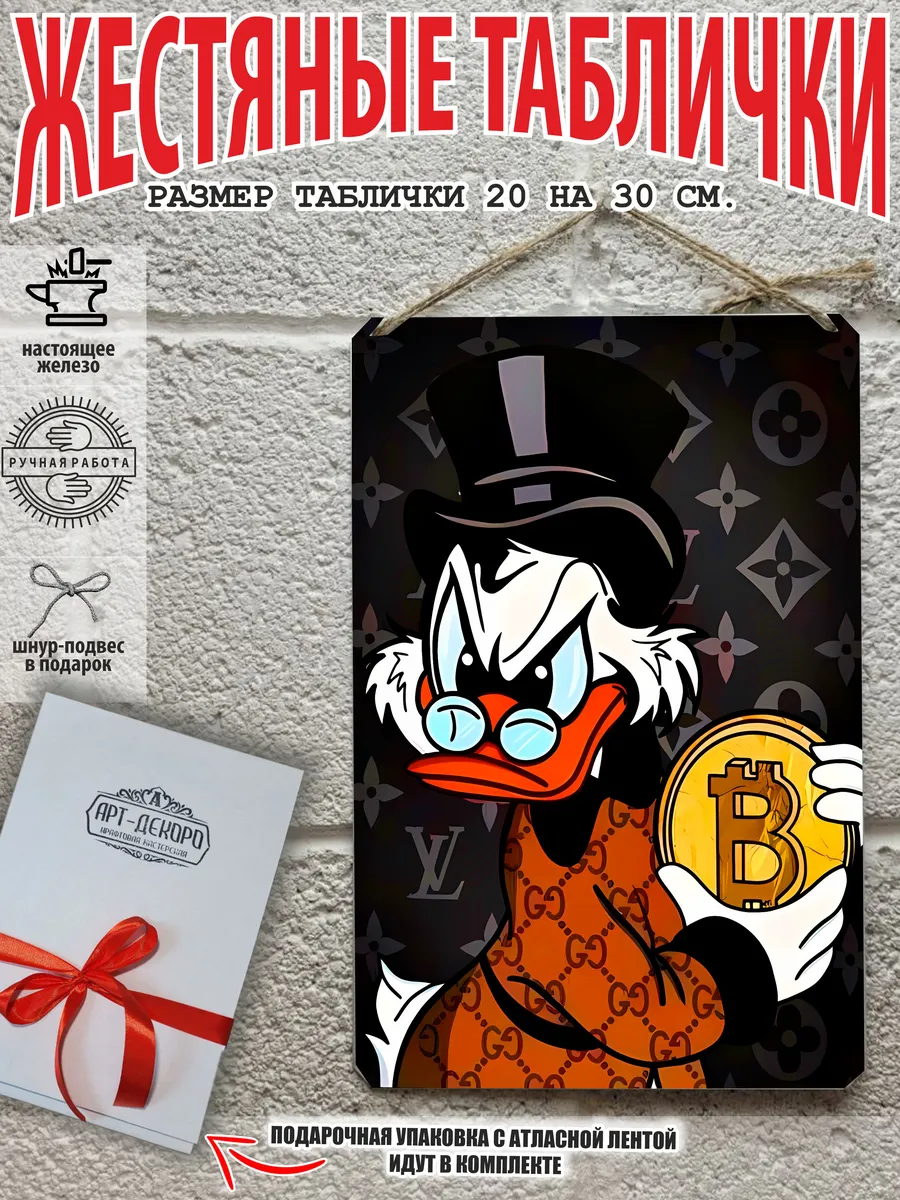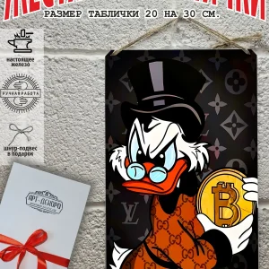 Скрудж Макдак символизирует богатство, достигнутое благодаря упорному труду, целеустремлённости и предпринимательской хватке. Также он является символом предприимчивости, темперамента и умения выживать в реалиях американской мультипликации и комиксов. Некоторые цитаты Скруджа Макдака про деньги: «Там, где вы видите старый сарай, я вижу дело с оборотом в миллион долларов!». «Деньги нельзя откладывать, их нужно вкладывать». «Чёрт побери! Сейчас хороших костюмов не шьют, 30–40 лет — и они рвутся». Несмотря на свои миллионы, Скрудж покупал качественную одежду и обувь, которую можно носить десятилетиями. «Деньги больше помогут, когда нет удачи, чем удача, когда нет денег». «Дорогая, я, конечно, хотел купить тебе бриллиантовое кольцо, но ювелирные были закрыты, поэтому я купил тебе йогурт». Так Скрудж хотел сделать приятное своей возлюбленной. «За маленький кусочек золота можно получить очень-очень много денег… Ха-ха! И для игры в шашки оно очень подходит». «Экономить, конечно, надо, но при чём тут мой шоколад?». «Я самая богатая утка на земле, потому что не трачу своих денег». Скрудж любил пользоваться бесплатными возможностями, которые экономили его деньги. Представляем вам стильные и эффектные жестяные таблички с изображением скруджа мак дака. Наши постеры деньги — жестяные таблички, выполнены из металла, который отличается высоким качеством и долговечностью. Размер 20×30 см позволяет легко вписать наши картины в любой интерьер, будь то кухня, гостиная, офис или кафе. Почему стоит выбрать наш постер для интерьера скрудж макдак? Яркие и насыщенные цвета не выгорают на солнце и делают ваше пространство выразительным и уникальным. Легкость в уходе: наши картины для интерьера, таблички на дверь и постеры на стену можно легко мыть. Они не боятся влаги, что позволяет использовать их как в помещениях, так и на улице. Удобные варианты крепления: табличка может быть установлена на саморезы, гвозди, кнопки, клейкую ленту, магниты или повешена на шнур из натурального джута, который идет в комплекте. Упаковка: каждая табличка аккуратно упакована в защитный пакет и дополнительно завернута в эко-картон, а также дополнительно в комплекте идет подарочная упаковка, атласная лента и открытка — что делает её отличным подарком на любой случай – от дня рождения до новоселья – готовый подарок. Мы гордимся тем, что предлагаем более 15 000 уникальных дизайнов, включая постеры на стену для интерьера, постер на заказ и прикольные металлические таблички, чтобы каждый мог найти что-то для себя. Наши постеры разделены на коллекции разных серий, что позволяет заказать несколько табличек в едином стиле и создать неповторимую композицию у вас дома, не упустите возможность сделать свой дом стильным – добавляйте товары в избранное, чтобы первыми узнавать о скидках и новинках! Создайте атмосферу уюта и стиля с нашими металлическими картинами и постерами для интерьера уже сегодня!