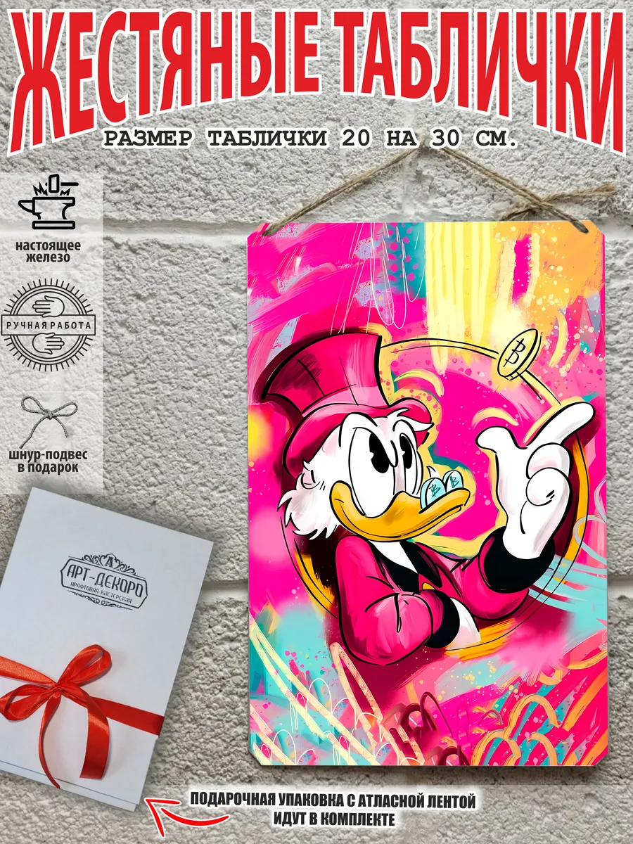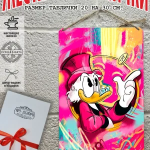 Скрудж Макдак символизирует богатство, достигнутое благодаря упорному труду, целеустремлённости и предпринимательской хватке. Также он является символом предприимчивости, темперамента и умения выживать в реалиях американской мультипликации и комиксов. Некоторые цитаты Скруджа Макдака про деньги: «Там, где вы видите старый сарай, я вижу дело с оборотом в миллион долларов!». «Деньги нельзя откладывать, их нужно вкладывать». «Чёрт побери! Сейчас хороших костюмов не шьют, 30–40 лет — и они рвутся». Несмотря на свои миллионы, Скрудж покупал качественную одежду и обувь, которую можно носить десятилетиями. «Деньги больше помогут, когда нет удачи, чем удача, когда нет денег». «Дорогая, я, конечно, хотел купить тебе бриллиантовое кольцо, но ювелирные были закрыты, поэтому я купил тебе йогурт». Так Скрудж хотел сделать приятное своей возлюбленной. «За маленький кусочек золота можно получить очень-очень много денег… Ха-ха! И для игры в шашки оно очень подходит». «Экономить, конечно, надо, но при чём тут мой шоколад?». «Я самая богатая утка на земле, потому что не трачу своих денег». Скрудж любил пользоваться бесплатными возможностями, которые экономили его деньги. Представляем вам стильные и эффектные жестяные таблички с изображением скруджа мак дака. Наши постеры деньги — жестяные таблички, выполнены из металла, который отличается высоким качеством и долговечностью. Размер 20×30 см позволяет легко вписать наши картины в любой интерьер, будь то кухня, гостиная, офис или кафе. Почему стоит выбрать наш постер для интерьера скрудж макдак? Яркие и насыщенные цвета не выгорают на солнце и делают ваше пространство выразительным и уникальным. Легкость в уходе: наши картины для интерьера, таблички на дверь и постеры на стену можно легко мыть. Они не боятся влаги, что позволяет использовать их как в помещениях, так и на улице. Удобные варианты крепления: табличка может быть установлена на саморезы, гвозди, кнопки, клейкую ленту, магниты или повешена на шнур из натурального джута, который идет в комплекте. Упаковка: каждая табличка аккуратно упакована в защитный пакет и дополнительно завернута в эко-картон, а также дополнительно в комплекте идет подарочная упаковка, атласная лента и открытка — что делает её отличным подарком на любой случай – от дня рождения до новоселья – готовый подарок. Мы гордимся тем, что предлагаем более 15 000 уникальных дизайнов, включая постеры на стену для интерьера, постер на заказ и прикольные металлические таблички, чтобы каждый мог найти что-то для себя. Наши постеры разделены на коллекции разных серий, что позволяет заказать несколько табличек в едином стиле и создать неповторимую композицию у вас дома, не упустите возможность сделать свой дом стильным – добавляйте товары в избранное, чтобы первыми узнавать о скидках и новинках! Создайте атмосферу уюта и стиля с нашими металлическими картинами и постерами для интерьера уже сегодня!
