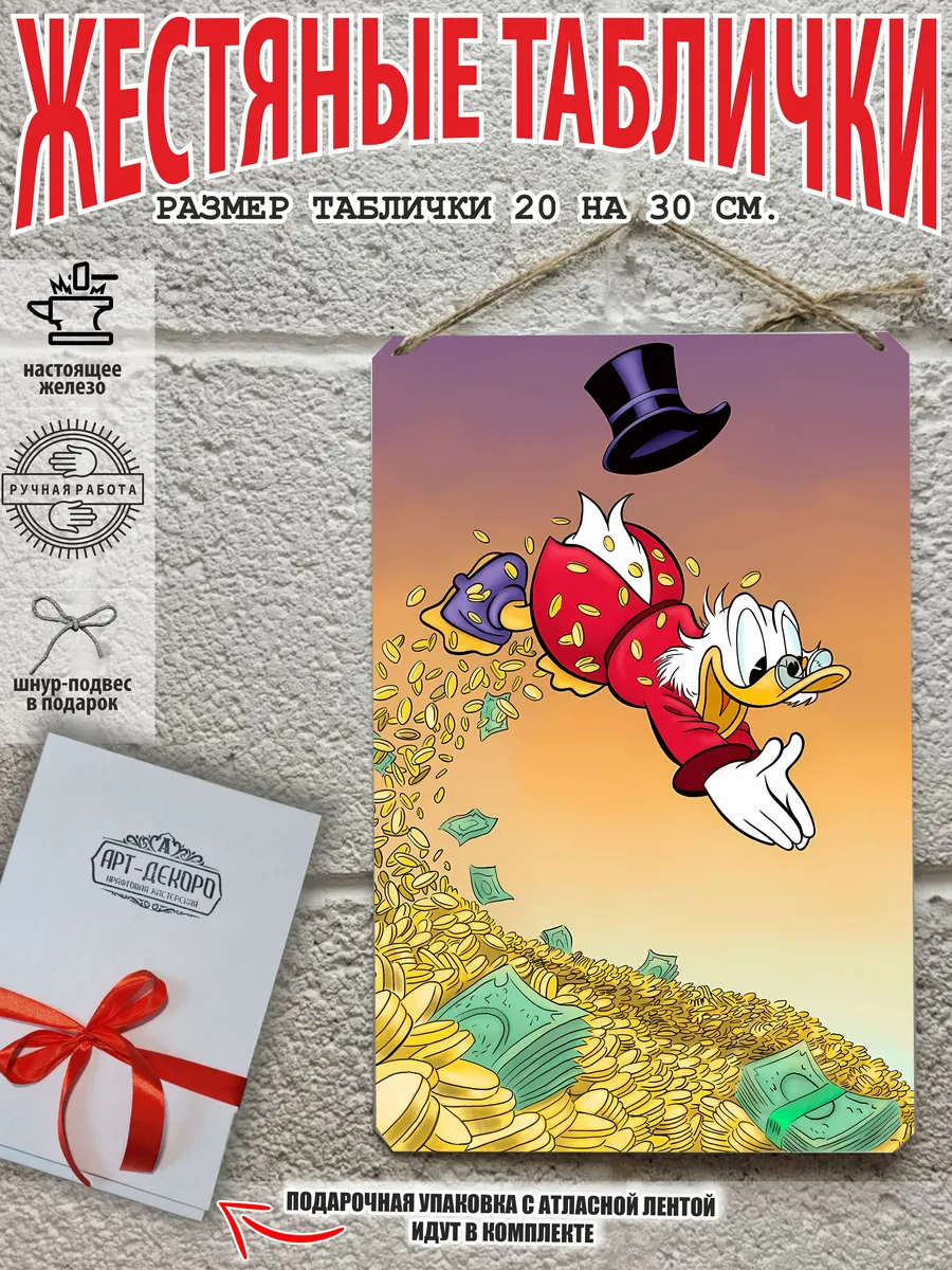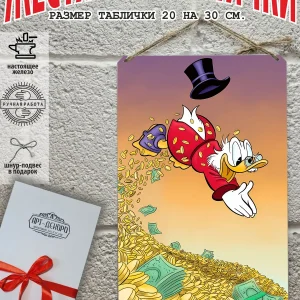 Скрудж Макдак символизирует богатство, достигнутое благодаря упорному труду, целеустремлённости и предпринимательской хватке. Также он является символом предприимчивости, темперамента и умения выживать в реалиях американской мультипликации и комиксов. Некоторые цитаты Скруджа Макдака про деньги: «Там, где вы видите старый сарай, я вижу дело с оборотом в миллион долларов!». «Деньги нельзя откладывать, их нужно вкладывать». «Чёрт побери! Сейчас хороших костюмов не шьют, 30–40 лет — и они рвутся». Несмотря на свои миллионы, Скрудж покупал качественную одежду и обувь, которую можно носить десятилетиями. «Деньги больше помогут, когда нет удачи, чем удача, когда нет денег». «Дорогая, я, конечно, хотел купить тебе бриллиантовое кольцо, но ювелирные были закрыты, поэтому я купил тебе йогурт». Так Скрудж хотел сделать приятное своей возлюбленной. «За маленький кусочек золота можно получить очень-очень много денег… Ха-ха! И для игры в шашки оно очень подходит». «Экономить, конечно, надо, но при чём тут мой шоколад?». «Я самая богатая утка на земле, потому что не трачу своих денег». Скрудж любил пользоваться бесплатными возможностями, которые экономили его деньги. Представляем вам стильные и эффектные жестяные таблички с изображением скруджа мак дака. Наши постеры деньги — жестяные таблички, выполнены из металла, который отличается высоким качеством и долговечностью. Размер 20×30 см позволяет легко вписать наши картины в любой интерьер, будь то кухня, гостиная, офис или кафе. Почему стоит выбрать наш постер для интерьера скрудж макдак? Яркие и насыщенные цвета не выгорают на солнце и делают ваше пространство выразительным и уникальным. Легкость в уходе: наши картины для интерьера, таблички на дверь и постеры на стену можно легко мыть. Они не боятся влаги, что позволяет использовать их как в помещениях, так и на улице. Удобные варианты крепления: табличка может быть установлена на саморезы, гвозди, кнопки, клейкую ленту, магниты или повешена на шнур из натурального джута, который идет в комплекте. Упаковка: каждая табличка аккуратно упакована в защитный пакет и дополнительно завернута в эко-картон, а также дополнительно в комплекте идет подарочная упаковка, атласная лента и открытка — что делает её отличным подарком на любой случай – от дня рождения до новоселья – готовый подарок. Мы гордимся тем, что предлагаем более 15 000 уникальных дизайнов, включая постеры на стену для интерьера, постер на заказ и прикольные металлические таблички, чтобы каждый мог найти что-то для себя. Наши постеры разделены на коллекции разных серий, что позволяет заказать несколько табличек в едином стиле и создать неповторимую композицию у вас дома, не упустите возможность сделать свой дом стильным – добавляйте товары в избранное, чтобы первыми узнавать о скидках и новинках! Создайте атмосферу уюта и стиля с нашими металлическими картинами и постерами для интерьера уже сегодня!