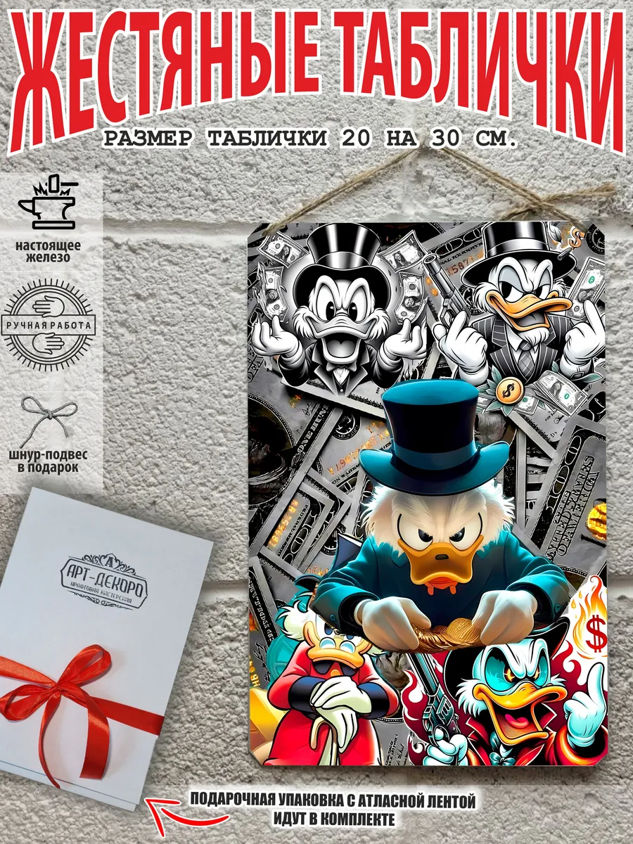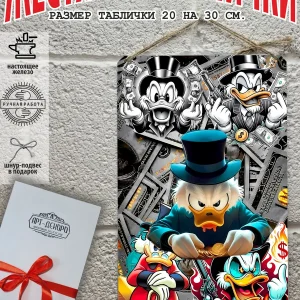 Скрудж Макдак символизирует богатство, достигнутое благодаря упорному труду, целеустремлённости и предпринимательской хватке. Также он является символом предприимчивости, темперамента и умения выживать в реалиях американской мультипликации и комиксов. Некоторые цитаты Скруджа Макдака про деньги: «Там, где вы видите старый сарай, я вижу дело с оборотом в миллион долларов!». «Деньги нельзя откладывать, их нужно вкладывать». «Чёрт побери! Сейчас хороших костюмов не шьют, 30–40 лет — и они рвутся». Несмотря на свои миллионы, Скрудж покупал качественную одежду и обувь, которую можно носить десятилетиями. «Деньги больше помогут, когда нет удачи, чем удача, когда нет денег». «Дорогая, я, конечно, хотел купить тебе бриллиантовое кольцо, но ювелирные были закрыты, поэтому я купил тебе йогурт». Так Скрудж хотел сделать приятное своей возлюбленной. «За маленький кусочек золота можно получить очень-очень много денег… Ха-ха! И для игры в шашки оно очень подходит». «Экономить, конечно, надо, но при чём тут мой шоколад?». «Я самая богатая утка на земле, потому что не трачу своих денег». Скрудж любил пользоваться бесплатными возможностями, которые экономили его деньги. Представляем вам стильные и эффектные жестяные таблички с изображением скруджа мак дака. Наши постеры деньги — жестяные таблички, выполнены из металла, который отличается высоким качеством и долговечностью. Размер 20×30 см позволяет легко вписать наши картины в любой интерьер, будь то кухня, гостиная, офис или кафе. Почему стоит выбрать наш постер для интерьера скрудж макдак? Яркие и насыщенные цвета не выгорают на солнце и делают ваше пространство выразительным и уникальным. Легкость в уходе: наши картины для интерьера, таблички на дверь и постеры на стену можно легко мыть. Они не боятся влаги, что позволяет использовать их как в помещениях, так и на улице. Удобные варианты крепления: табличка может быть установлена на саморезы, гвозди, кнопки, клейкую ленту, магниты или повешена на шнур из натурального джута, который идет в комплекте. Упаковка: каждая табличка аккуратно упакована в защитный пакет и дополнительно завернута в эко-картон, а также дополнительно в комплекте идет подарочная упаковка, атласная лента и открытка — что делает её отличным подарком на любой случай – от дня рождения до новоселья – готовый подарок. Мы гордимся тем, что предлагаем более 15 000 уникальных дизайнов, включая постеры на стену для интерьера, постер на заказ и прикольные металлические таблички, чтобы каждый мог найти что-то для себя. Наши постеры разделены на коллекции разных серий, что позволяет заказать несколько табличек в едином стиле и создать неповторимую композицию у вас дома, не упустите возможность сделать свой дом стильным – добавляйте товары в избранное, чтобы первыми узнавать о скидках и новинках! Создайте атмосферу уюта и стиля с нашими металлическими картинами и постерами для интерьера уже сегодня!