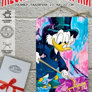 Скрудж Макдак символизирует богатство, достигнутое благодаря упорному труду, целеустремлённости и предпринимательской хватке. Также он является символом предприимчивости, темперамента и умения выживать в реалиях американской мультипликации и комиксов. Некоторые цитаты Скруджа Макдака про деньги: «Там, где вы видите старый сарай, я вижу дело с оборотом в миллион долларов!». «Деньги нельзя откладывать, их нужно вкладывать». «Чёрт побери! Сейчас хороших костюмов не шьют, 30–40 лет — и они рвутся». Несмотря на свои миллионы, Скрудж покупал качественную одежду и обувь, которую можно носить десятилетиями. «Деньги больше помогут, когда нет удачи, чем удача, когда нет денег». «Дорогая, я, конечно, хотел купить тебе бриллиантовое кольцо, но ювелирные были закрыты, поэтому я купил тебе йогурт». Так Скрудж хотел сделать приятное своей возлюбленной. «За маленький кусочек золота можно получить очень-очень много денег… Ха-ха! И для игры в шашки оно очень подходит». «Экономить, конечно, надо, но при чём тут мой шоколад?». «Я самая богатая утка на земле, потому что не трачу своих денег». Скрудж любил пользоваться бесплатными возможностями, которые экономили его деньги. Представляем вам стильные и эффектные жестяные таблички с изображением скруджа мак дака. Наши постеры деньги — жестяные таблички, выполнены из металла, который отличается высоким качеством и долговечностью. Размер 20×30 см позволяет легко вписать наши картины в любой интерьер, будь то кухня, гостиная, офис или кафе. Почему стоит выбрать наш постер для интерьера скрудж макдак? Яркие и насыщенные цвета не выгорают на солнце и делают ваше пространство выразительным и уникальным. Легкость в уходе: наши картины для интерьера, таблички на дверь и постеры на стену можно легко мыть. Они не боятся влаги, что позволяет использовать их как в помещениях, так и на улице. Удобные варианты крепления: табличка может быть установлена на саморезы, гвозди, кнопки, клейкую ленту, магниты или повешена на шнур из натурального джута, который идет в комплекте. Упаковка: каждая табличка аккуратно упакована в защитный пакет и дополнительно завернута в эко-картон, а также дополнительно в комплекте идет подарочная упаковка, атласная лента и открытка — что делает её отличным подарком на любой случай – от дня рождения до новоселья – готовый подарок. Мы гордимся тем, что предлагаем более 15 000 уникальных дизайнов, включая постеры на стену для интерьера, постер на заказ и прикольные металлические таблички, чтобы каждый мог найти что-то для себя. Наши постеры разделены на коллекции разных серий, что позволяет заказать несколько табличек в едином стиле и создать неповторимую композицию у вас дома, не упустите возможность сделать свой дом стильным – добавляйте товары в избранное, чтобы первыми узнавать о скидках и новинках! Создайте атмосферу уюта и стиля с нашими металлическими картинами и постерами для интерьера уже сегодня!