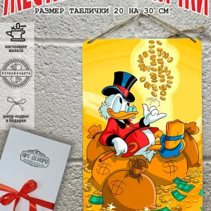 Скрудж Макдак символизирует богатство, достигнутое благодаря упорному труду, целеустремлённости и предпринимательской хватке. Также он является символом предприимчивости, темперамента и умения выживать в реалиях американской мультипликации и комиксов. Некоторые цитаты Скруджа Макдака про деньги: «Там, где вы видите старый сарай, я вижу дело с оборотом в миллион долларов!». «Деньги нельзя откладывать, их нужно вкладывать». «Чёрт побери! Сейчас хороших костюмов не шьют, 30–40 лет — и они рвутся». Несмотря на свои миллионы, Скрудж покупал качественную одежду и обувь, которую можно носить десятилетиями. «Деньги больше помогут, когда нет удачи, чем удача, когда нет денег». «Дорогая, я, конечно, хотел купить тебе бриллиантовое кольцо, но ювелирные были закрыты, поэтому я купил тебе йогурт». Так Скрудж хотел сделать приятное своей возлюбленной. «За маленький кусочек золота можно получить очень-очень много денег… Ха-ха! И для игры в шашки оно очень подходит». «Экономить, конечно, надо, но при чём тут мой шоколад?». «Я самая богатая утка на земле, потому что не трачу своих денег». Скрудж любил пользоваться бесплатными возможностями, которые экономили его деньги. Представляем вам стильные и эффектные жестяные таблички с изображением скруджа мак дака. Наши постеры деньги — жестяные таблички, выполнены из металла, который отличается высоким качеством и долговечностью. Размер 20×30 см позволяет легко вписать наши картины в любой интерьер, будь то кухня, гостиная, офис или кафе. Почему стоит выбрать наш постер для интерьера скрудж макдак? Яркие и насыщенные цвета не выгорают на солнце и делают ваше пространство выразительным и уникальным. Легкость в уходе: наши картины для интерьера, таблички на дверь и постеры на стену можно легко мыть. Они не боятся влаги, что позволяет использовать их как в помещениях, так и на улице. Удобные варианты крепления: табличка может быть установлена на саморезы, гвозди, кнопки, клейкую ленту, магниты или повешена на шнур из натурального джута, который идет в комплекте. Упаковка: каждая табличка аккуратно упакована в защитный пакет и дополнительно завернута в эко-картон, а также дополнительно в комплекте идет подарочная упаковка, атласная лента и открытка — что делает её отличным подарком на любой случай – от дня рождения до новоселья – готовый подарок. Мы гордимся тем, что предлагаем более 15 000 уникальных дизайнов, включая постеры на стену для интерьера, постер на заказ и прикольные металлические таблички, чтобы каждый мог найти что-то для себя. Наши постеры разделены на коллекции разных серий, что позволяет заказать несколько табличек в едином стиле и создать неповторимую композицию у вас дома, не упустите возможность сделать свой дом стильным – добавляйте товары в избранное, чтобы первыми узнавать о скидках и новинках! Создайте атмосферу уюта и стиля с нашими металлическими картинами и постерами для интерьера уже сегодня!
