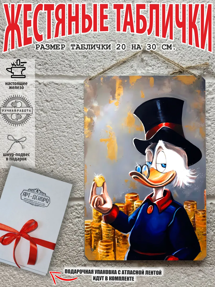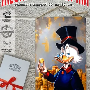 Скрудж Макдак символизирует богатство, достигнутое благодаря упорному труду, целеустремлённости и предпринимательской хватке. Также он является символом предприимчивости, темперамента и умения выживать в реалиях американской мультипликации и комиксов. Некоторые цитаты Скруджа Макдака про деньги: «Там, где вы видите старый сарай, я вижу дело с оборотом в миллион долларов!». «Деньги нельзя откладывать, их нужно вкладывать». «Чёрт побери! Сейчас хороших костюмов не шьют, 30–40 лет — и они рвутся». Несмотря на свои миллионы, Скрудж покупал качественную одежду и обувь, которую можно носить десятилетиями. «Деньги больше помогут, когда нет удачи, чем удача, когда нет денег». «Дорогая, я, конечно, хотел купить тебе бриллиантовое кольцо, но ювелирные были закрыты, поэтому я купил тебе йогурт». Так Скрудж хотел сделать приятное своей возлюбленной. «За маленький кусочек золота можно получить очень-очень много денег… Ха-ха! И для игры в шашки оно очень подходит». «Экономить, конечно, надо, но при чём тут мой шоколад?». «Я самая богатая утка на земле, потому что не трачу своих денег». Скрудж любил пользоваться бесплатными возможностями, которые экономили его деньги. Представляем вам стильные и эффектные жестяные таблички с изображением скруджа мак дака. Наши постеры деньги — жестяные таблички, выполнены из металла, который отличается высоким качеством и долговечностью. Размер 20×30 см позволяет легко вписать наши картины в любой интерьер, будь то кухня, гостиная, офис или кафе. Почему стоит выбрать наш постер для интерьера скрудж макдак? Яркие и насыщенные цвета не выгорают на солнце и делают ваше пространство выразительным и уникальным. Легкость в уходе: наши картины для интерьера, таблички на дверь и постеры на стену можно легко мыть. Они не боятся влаги, что позволяет использовать их как в помещениях, так и на улице. Удобные варианты крепления: табличка может быть установлена на саморезы, гвозди, кнопки, клейкую ленту, магниты или повешена на шнур из натурального джута, который идет в комплекте. Упаковка: каждая табличка аккуратно упакована в защитный пакет и дополнительно завернута в эко-картон, а также дополнительно в комплекте идет подарочная упаковка, атласная лента и открытка — что делает её отличным подарком на любой случай – от дня рождения до новоселья – готовый подарок. Мы гордимся тем, что предлагаем более 15 000 уникальных дизайнов, включая постеры на стену для интерьера, постер на заказ и прикольные металлические таблички, чтобы каждый мог найти что-то для себя. Наши постеры разделены на коллекции разных серий, что позволяет заказать несколько табличек в едином стиле и создать неповторимую композицию у вас дома, не упустите возможность сделать свой дом стильным – добавляйте товары в избранное, чтобы первыми узнавать о скидках и новинках! Создайте атмосферу уюта и стиля с нашими металлическими картинами и постерами для интерьера уже сегодня!