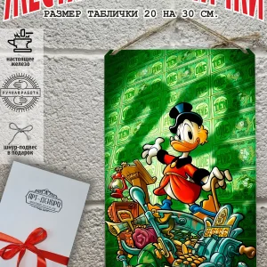 Скрудж Макдак символизирует богатство, достигнутое благодаря упорному труду, целеустремлённости и предпринимательской хватке. Также он является символом предприимчивости, темперамента и умения выживать в реалиях американской мультипликации и комиксов. Некоторые цитаты Скруджа Макдака про деньги: «Там, где вы видите старый сарай, я вижу дело с оборотом в миллион долларов!». «Деньги нельзя откладывать, их нужно вкладывать». «Чёрт побери! Сейчас хороших костюмов не шьют, 30–40 лет — и они рвутся». Несмотря на свои миллионы, Скрудж покупал качественную одежду и обувь, которую можно носить десятилетиями. «Деньги больше помогут, когда нет удачи, чем удача, когда нет денег». «Дорогая, я, конечно, хотел купить тебе бриллиантовое кольцо, но ювелирные были закрыты, поэтому я купил тебе йогурт». Так Скрудж хотел сделать приятное своей возлюбленной. «За маленький кусочек золота можно получить очень-очень много денег… Ха-ха! И для игры в шашки оно очень подходит». «Экономить, конечно, надо, но при чём тут мой шоколад?». «Я самая богатая утка на земле, потому что не трачу своих денег». Скрудж любил пользоваться бесплатными возможностями, которые экономили его деньги. Представляем вам стильные и эффектные жестяные таблички с изображением скруджа мак дака. Наши постеры деньги — жестяные таблички, выполнены из металла, который отличается высоким качеством и долговечностью. Размер 20×30 см позволяет легко вписать наши картины в любой интерьер, будь то кухня, гостиная, офис или кафе. Почему стоит выбрать наш постер для интерьера скрудж макдак? Яркие и насыщенные цвета не выгорают на солнце и делают ваше пространство выразительным и уникальным. Легкость в уходе: наши картины для интерьера, таблички на дверь и постеры на стену можно легко мыть. Они не боятся влаги, что позволяет использовать их как в помещениях, так и на улице. Удобные варианты крепления: табличка может быть установлена на саморезы, гвозди, кнопки, клейкую ленту, магниты или повешена на шнур из натурального джута, который идет в комплекте. Упаковка: каждая табличка аккуратно упакована в защитный пакет и дополнительно завернута в эко-картон, а также дополнительно в комплекте идет подарочная упаковка, атласная лента и открытка — что делает её отличным подарком на любой случай – от дня рождения до новоселья – готовый подарок. Мы гордимся тем, что предлагаем более 15 000 уникальных дизайнов, включая постеры на стену для интерьера, постер на заказ и прикольные металлические таблички, чтобы каждый мог найти что-то для себя. Наши постеры разделены на коллекции разных серий, что позволяет заказать несколько табличек в едином стиле и создать неповторимую композицию у вас дома, не упустите возможность сделать свой дом стильным – добавляйте товары в избранное, чтобы первыми узнавать о скидках и новинках! Создайте атмосферу уюта и стиля с нашими металлическими картинами и постерами для интерьера уже сегодня!