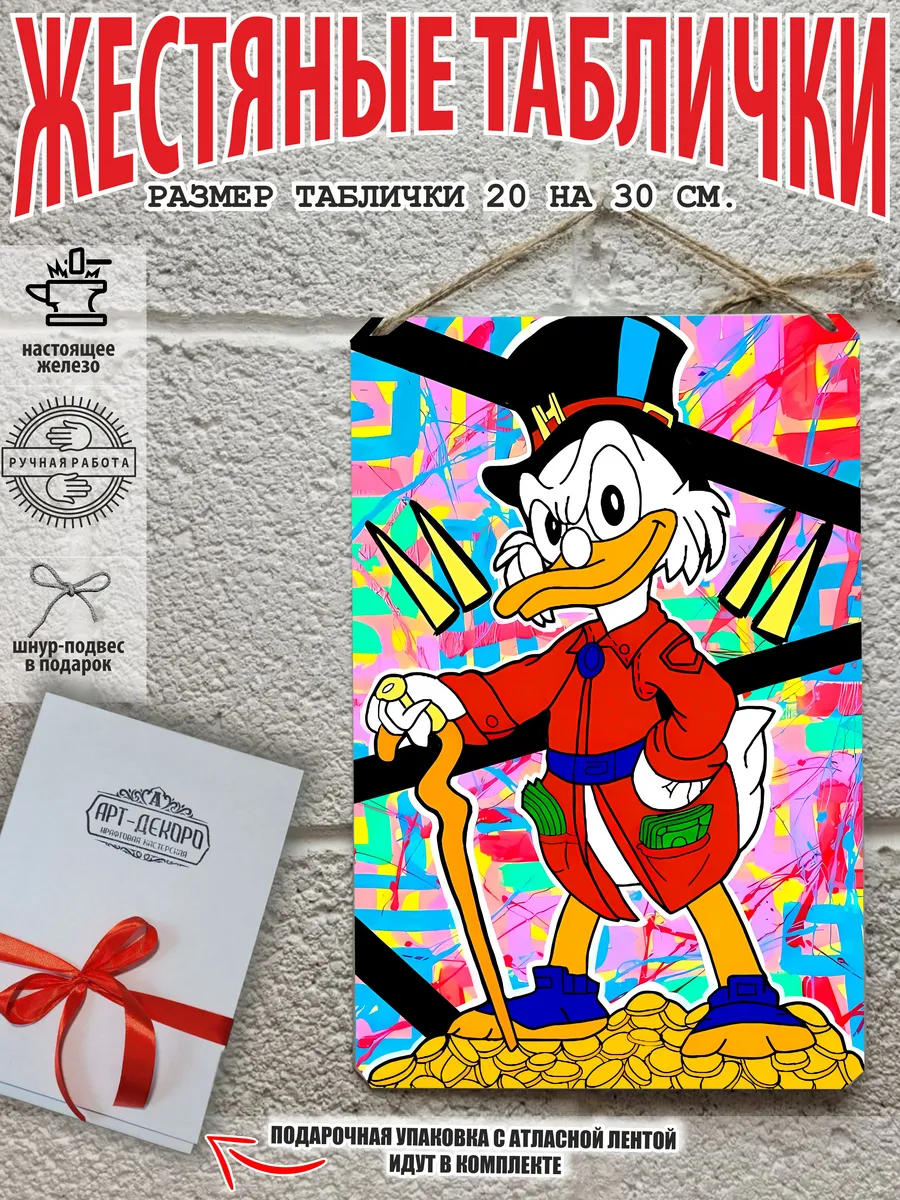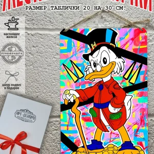 Скрудж Макдак символизирует богатство, достигнутое благодаря упорному труду, целеустремлённости и предпринимательской хватке. Также он является символом предприимчивости, темперамента и умения выживать в реалиях американской мультипликации и комиксов. Некоторые цитаты Скруджа Макдака про деньги: «Там, где вы видите старый сарай, я вижу дело с оборотом в миллион долларов!». «Деньги нельзя откладывать, их нужно вкладывать». «Чёрт побери! Сейчас хороших костюмов не шьют, 30–40 лет — и они рвутся». Несмотря на свои миллионы, Скрудж покупал качественную одежду и обувь, которую можно носить десятилетиями. «Деньги больше помогут, когда нет удачи, чем удача, когда нет денег». «Дорогая, я, конечно, хотел купить тебе бриллиантовое кольцо, но ювелирные были закрыты, поэтому я купил тебе йогурт». Так Скрудж хотел сделать приятное своей возлюбленной. «За маленький кусочек золота можно получить очень-очень много денег… Ха-ха! И для игры в шашки оно очень подходит». «Экономить, конечно, надо, но при чём тут мой шоколад?». «Я самая богатая утка на земле, потому что не трачу своих денег». Скрудж любил пользоваться бесплатными возможностями, которые экономили его деньги. Представляем вам стильные и эффектные жестяные таблички с изображением скруджа мак дака. Наши постеры деньги — жестяные таблички, выполнены из металла, который отличается высоким качеством и долговечностью. Размер 20×30 см позволяет легко вписать наши картины в любой интерьер, будь то кухня, гостиная, офис или кафе. Почему стоит выбрать наш постер для интерьера скрудж макдак? Яркие и насыщенные цвета не выгорают на солнце и делают ваше пространство выразительным и уникальным. Легкость в уходе: наши картины для интерьера, таблички на дверь и постеры на стену можно легко мыть. Они не боятся влаги, что позволяет использовать их как в помещениях, так и на улице. Удобные варианты крепления: табличка может быть установлена на саморезы, гвозди, кнопки, клейкую ленту, магниты или повешена на шнур из натурального джута, который идет в комплекте. Упаковка: каждая табличка аккуратно упакована в защитный пакет и дополнительно завернута в эко-картон, а также дополнительно в комплекте идет подарочная упаковка, атласная лента и открытка — что делает её отличным подарком на любой случай – от дня рождения до новоселья – готовый подарок. Мы гордимся тем, что предлагаем более 15 000 уникальных дизайнов, включая постеры на стену для интерьера, постер на заказ и прикольные металлические таблички, чтобы каждый мог найти что-то для себя. Наши постеры разделены на коллекции разных серий, что позволяет заказать несколько табличек в едином стиле и создать неповторимую композицию у вас дома, не упустите возможность сделать свой дом стильным – добавляйте товары в избранное, чтобы первыми узнавать о скидках и новинках! Создайте атмосферу уюта и стиля с нашими металлическими картинами и постерами для интерьера уже сегодня!
