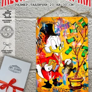 Скрудж Макдак символизирует богатство, достигнутое благодаря упорному труду, целеустремлённости и предпринимательской хватке. Также он является символом предприимчивости, темперамента и умения выживать в реалиях американской мультипликации и комиксов. Некоторые цитаты Скруджа Макдака про деньги: «Там, где вы видите старый сарай, я вижу дело с оборотом в миллион долларов!». «Деньги нельзя откладывать, их нужно вкладывать». «Чёрт побери! Сейчас хороших костюмов не шьют, 30–40 лет — и они рвутся». Несмотря на свои миллионы, Скрудж покупал качественную одежду и обувь, которую можно носить десятилетиями. «Деньги больше помогут, когда нет удачи, чем удача, когда нет денег». «Дорогая, я, конечно, хотел купить тебе бриллиантовое кольцо, но ювелирные были закрыты, поэтому я купил тебе йогурт». Так Скрудж хотел сделать приятное своей возлюбленной. «За маленький кусочек золота можно получить очень-очень много денег… Ха-ха! И для игры в шашки оно очень подходит». «Экономить, конечно, надо, но при чём тут мой шоколад?». «Я самая богатая утка на земле, потому что не трачу своих денег». Скрудж любил пользоваться бесплатными возможностями, которые экономили его деньги. Представляем вам стильные и эффектные жестяные таблички с изображением скруджа мак дака. Наши постеры деньги — жестяные таблички, выполнены из металла, который отличается высоким качеством и долговечностью. Размер 20×30 см позволяет легко вписать наши картины в любой интерьер, будь то кухня, гостиная, офис или кафе. Почему стоит выбрать наш постер для интерьера скрудж макдак? Яркие и насыщенные цвета не выгорают на солнце и делают ваше пространство выразительным и уникальным. Легкость в уходе: наши картины для интерьера, таблички на дверь и постеры на стену можно легко мыть. Они не боятся влаги, что позволяет использовать их как в помещениях, так и на улице. Удобные варианты крепления: табличка может быть установлена на саморезы, гвозди, кнопки, клейкую ленту, магниты или повешена на шнур из натурального джута, который идет в комплекте. Упаковка: каждая табличка аккуратно упакована в защитный пакет и дополнительно завернута в эко-картон, а также дополнительно в комплекте идет подарочная упаковка, атласная лента и открытка — что делает её отличным подарком на любой случай – от дня рождения до новоселья – готовый подарок. Мы гордимся тем, что предлагаем более 15 000 уникальных дизайнов, включая постеры на стену для интерьера, постер на заказ и прикольные металлические таблички, чтобы каждый мог найти что-то для себя. Наши постеры разделены на коллекции разных серий, что позволяет заказать несколько табличек в едином стиле и создать неповторимую композицию у вас дома, не упустите возможность сделать свой дом стильным – добавляйте товары в избранное, чтобы первыми узнавать о скидках и новинках! Создайте атмосферу уюта и стиля с нашими металлическими картинами и постерами для интерьера уже сегодня!