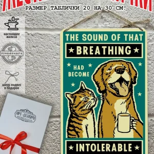 «Звук этого дыхания невосимый» — железная табличка голден ретривер и кот винтажный постер из 100% металла от нашего бренда будет прекрасным украшением для квартиры, дома, офиса, бара или кафе.