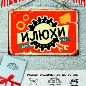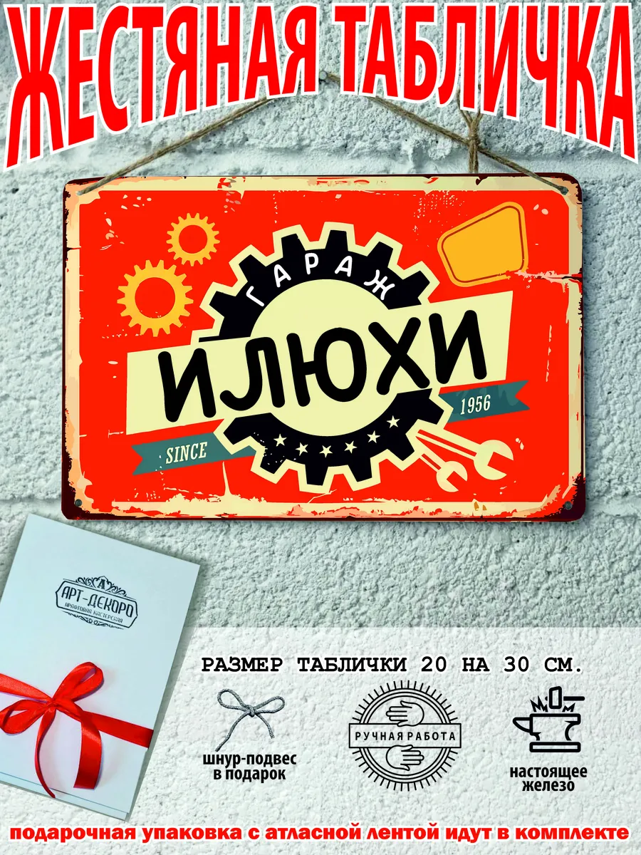 комплектация: именная табличка для гаража, шнур-подвес из натурального джута, подарочная упаковка, атласная лента, открытка, защитная упаковка от царапин, транспортировочная упаковка