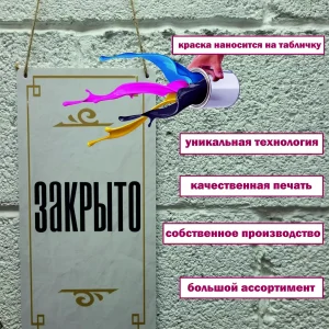 Информационная вывеска открыто закрыто имеет классический размер 30 см х 15 см. Высокое качество печати и прочная основа из ПВХ-пластика толщиной 3мм. делают таблички для кабинета долговечными. Материал обладает такими качествами как влагостойкость, устойчивость к уф-лучам и перепадам температур. Для нанесения изображения мы применяем современную технологию печати. Картинка и цвета будут оставаться в первоначальном виде долгие годы без выгорания.