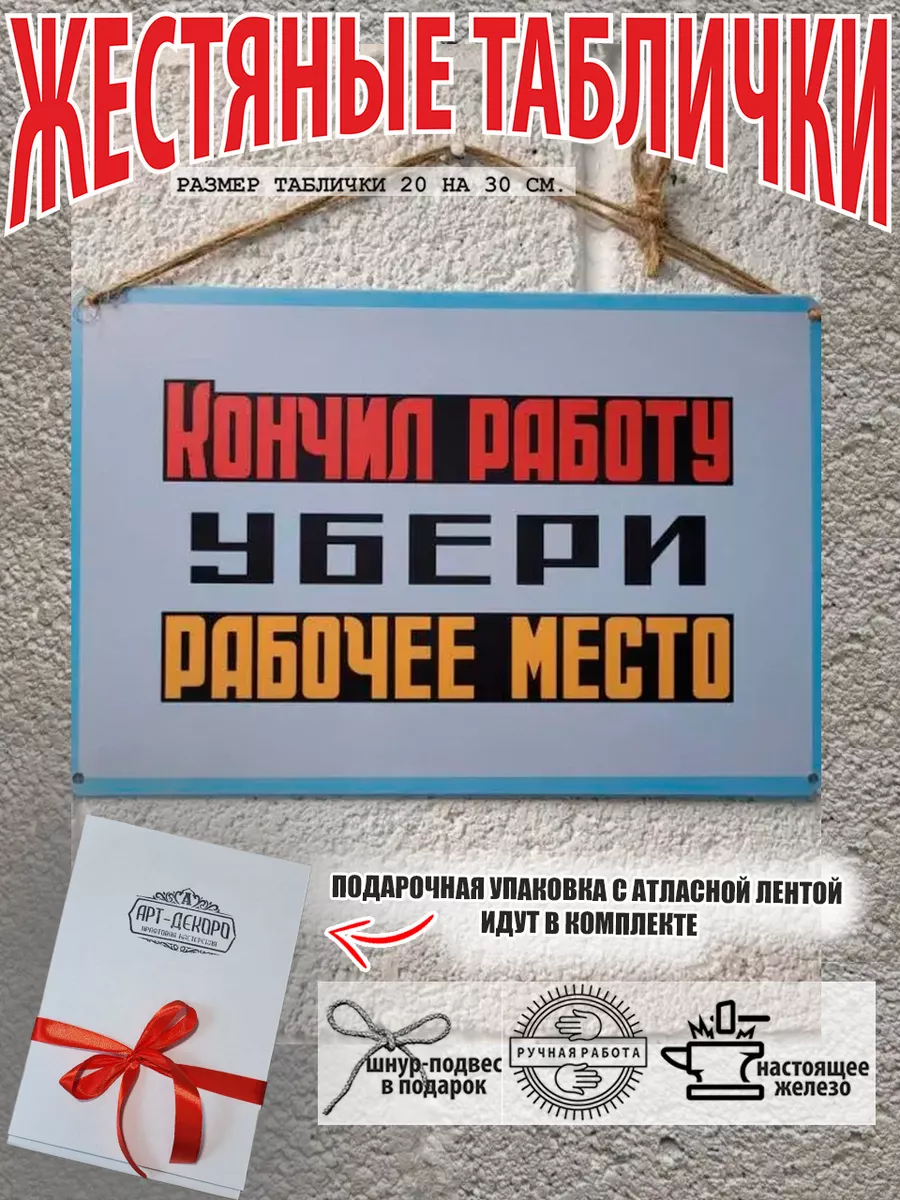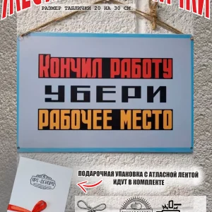 Табличка «Убери рабочее место» — это эффективный способ напомнить сотрудникам о важности соблюдения правил техники безопасности и соблюдения порядка на рабочем месте. Изготовленная из прочного 100% металла, табличка прослужит долгое время, сохраняя свой презентабельный вид. Размер 30 на 20 см. Шнур-подвес из натурального джута, который идет в подарок к каждой табличке, позволяет легко разместить табличку на стене, заборе или двери, обеспечивая ее заметность. А так же по углам таблички есть отверстия 5 мм, что позволяет разнообразить варианты крепления. Яркий дизайн и четкий текст привлекут внимание и станут постоянным напоминанием о необходимости соблюдать меры предосторожности. Прочная табличка для производственных помещений. Таблички для производства, цеха.