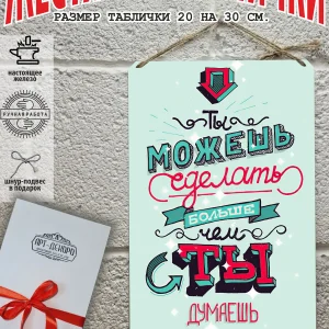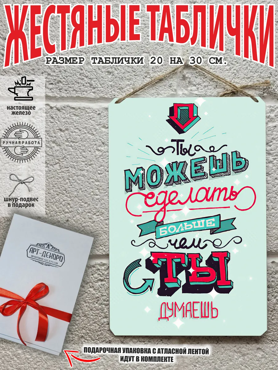 Обратите внимание! У нас все таблички идут сериями, можно создать отличную композицию в одном стиле. Кроме того, таблички это стильный и недорогой подарок по любому поводу. Прикольные штуки железная табличка картинки мотиваторы позитивные и демотиваторы из 100% металла от нашего бренда будет прекрасным украшением для квартиры, дома, офиса, бара или кафе. Мотивация это прикол, часть нашей жизни, картина мотиватор всегда улучшает настроение. Сочетая в себе эстетику и прочность, декоративная металлические мотивационные карточки являются непременным элементом декора как для внутренних помещений, так и для уличных зон. Выберите из нашего широкого ассортимента аксессуар, который подойдет именно вам. Жестяная табличка Арт-Декоро крепится на саморезы, шурупы или на специальный шнур из натурального джута который идет в комплекте с каждым заказом как бесплатный подарок, что позволяет разнообразить способы использования. Плакаты с приколами можно повесить на стену в гостиной, спальне, кухне или на улице, чтобы создать атмосферу, которая отражает индивидуальность. Таблички можно мыть, они не выцветают долгие годы. Картина открытки постер плакат стикеры наклейки приколы мотивация все это сочетается в наших изделиях. Мы гордимся тем, что каждое изделие изготовлено из настоящего металла, краска наносится прямо на железо. Это гарантирует ее долговечность и надежность. Красивая и изысканная отделка обеспечивает эффектный внешний вид и придает обстановке особое очарование. Подарите возможность добавить изюминку в интерьер и превратите пространство в уникальное, а также уютное место, которое будет отличаться от всех остальных. В нашем магазине Вы найдёте большой выбор декора интерьера и создадите превосходную обстановку.