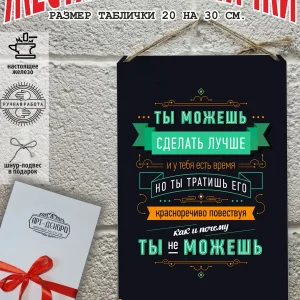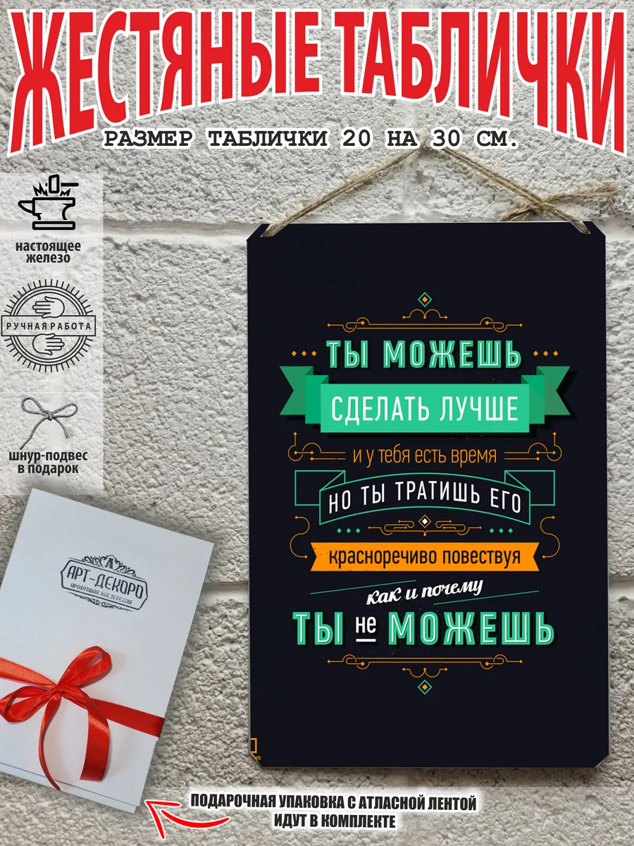 Обратите внимание! У нас все таблички идут сериями, можно создать отличную композицию в одном стиле. Кроме того, таблички это стильный и недорогой подарок по любому поводу. Прикольные штуки железная табличка картинки мотиваторы позитивные и демотиваторы из 100% металла от нашего бренда будет прекрасным украшением для квартиры, дома, офиса, бара или кафе. Мотивация это прикол, часть нашей жизни, картина мотиватор всегда улучшает настроение. Сочетая в себе эстетику и прочность, декоративная металлические мотивационные карточки являются непременным элементом декора как для внутренних помещений, так и для уличных зон. Выберите из нашего широкого ассортимента аксессуар, который подойдет именно вам. Жестяная табличка Арт-Декоро крепится на саморезы, шурупы или на специальный шнур из натурального джута который идет в комплекте с каждым заказом как бесплатный подарок, что позволяет разнообразить способы использования. Плакаты с приколами можно повесить на стену в гостиной, спальне, кухне или на улице, чтобы создать атмосферу, которая отражает индивидуальность. Таблички можно мыть, они не выцветают долгие годы. Картина открытки постер плакат стикеры наклейки приколы мотивация все это сочетается в наших изделиях. Мы гордимся тем, что каждое изделие изготовлено из настоящего металла, краска наносится прямо на железо. Это гарантирует ее долговечность и надежность. Красивая и изысканная отделка обеспечивает эффектный внешний вид и придает обстановке особое очарование. Подарите возможность добавить изюминку в интерьер и превратите пространство в уникальное, а также уютное место, которое будет отличаться от всех остальных. В нашем магазине Вы найдёте большой выбор декора интерьера и создадите превосходную обстановку.