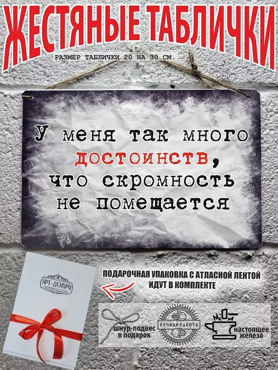 Обратите внимание! У нас все таблички идут сериями, можно создать отличную композицию в одном стиле. Кроме того, таблички это стильный и недорогой подарок по любому поводу. Прикольные штуки железная табличка картинки мотиваторы позитивные и демотиваторы из 100% металла от нашего бренда будет прекрасным украшением для квартиры, дома, офиса, бара или кафе. Мотивация это прикол, часть нашей жизни, картина мотиватор всегда улучшает настроение. Сочетая в себе эстетику и прочность, декоративная металлические мотивационные карточки являются непременным элементом декора как для внутренних помещений, так и для уличных зон. Выберите из нашего широкого ассортимента аксессуар, который подойдет именно вам. Жестяная табличка Арт-Декоро крепится на саморезы, шурупы или на специальный шнур из натурального джута который идет в комплекте с каждым заказом как бесплатный подарок, что позволяет разнообразить способы использования. Плакаты с приколами можно повесить на стену в гостиной, спальне, кухне или на улице, чтобы создать атмосферу, которая отражает индивидуальность. Таблички можно мыть, они не выцветают долгие годы. Картина открытки постер плакат стикеры наклейки приколы мотивация все это сочетается в наших изделиях. Мы гордимся тем, что каждое изделие изготовлено из настоящего металла, краска наносится прямо на железо. Это гарантирует ее долговечность и надежность. Красивая и изысканная отделка обеспечивает эффектный внешний вид и придает обстановке особое очарование. Подарите возможность добавить изюминку в интерьер и превратите пространство в уникальное, а также уютное место, которое будет отличаться от всех остальных. В нашем магазине Вы найдёте большой выбор декора интерьера и создадите превосходную обстановку.