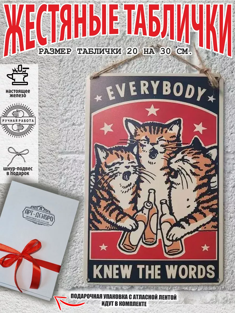Все знали эти слова — текст на картинке. Представляем вам стильные и эффектные жестяные таблички и картины, в том числе удивительные изображения котов на картинах художников. Все наши постеры, включая жестяные таблички, выполнены из высококачественного металла, обеспечивающего долговечность и устойчивость к солнечному свету. Размер 20×30 см позволяет легко интегрировать их в любой интерьер – будь то кухня, гостиная, офис или кафе.