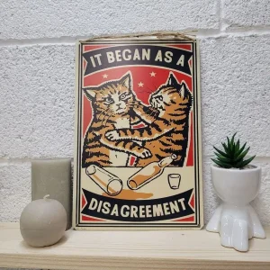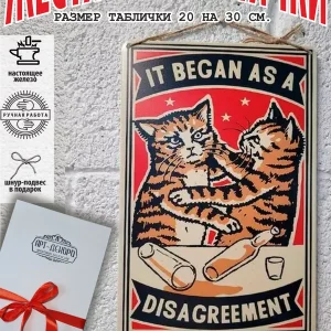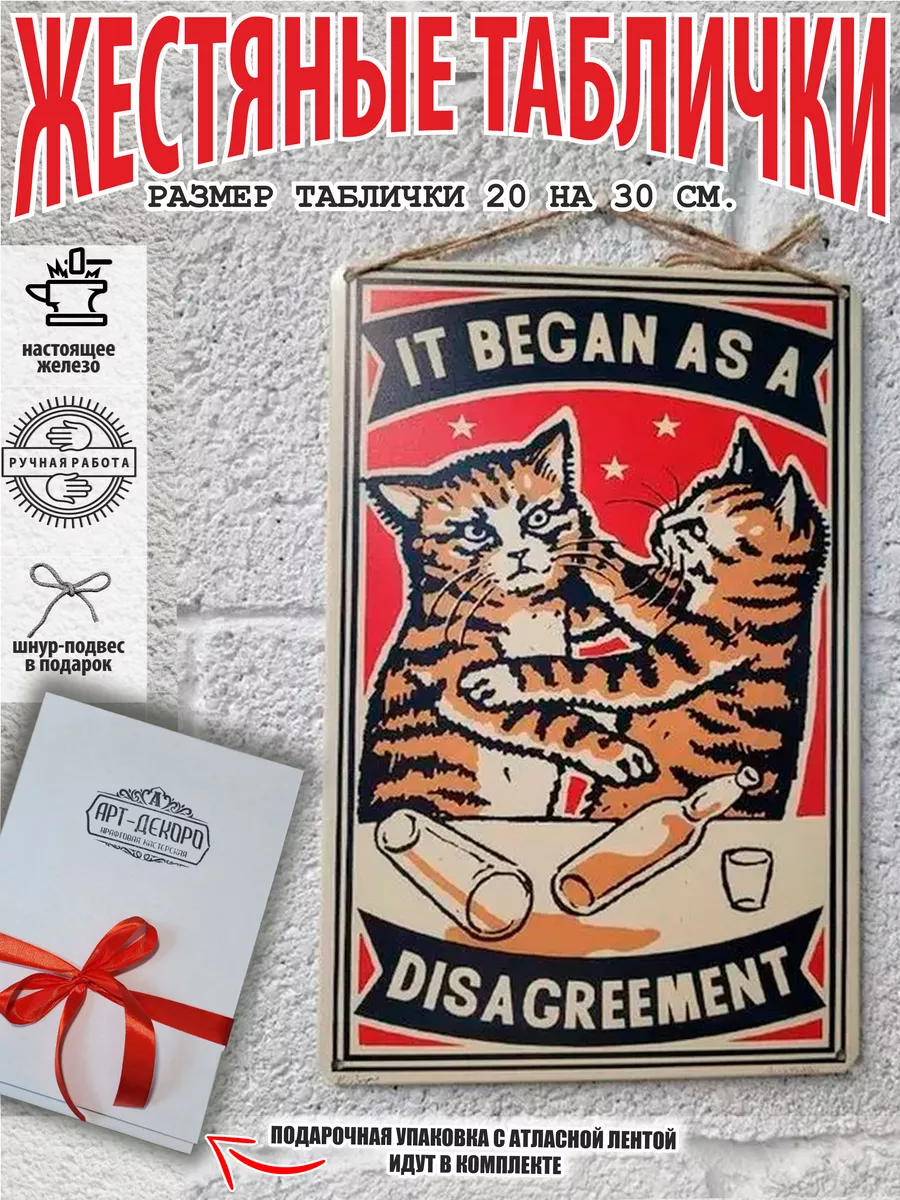 Все началось с разногласий — текст на картинке. Представляем вам стильные и эффектные жестяные таблички и картины, в том числе удивительные изображения котов на картинах художников. Все наши постеры, включая жестяные таблички, выполнены из высококачественного металла, обеспечивающего долговечность и устойчивость к солнечному свету. Размер 20×30 см позволяет легко интегрировать их в любой интерьер – будь то кухня, гостиная, офис или кафе.