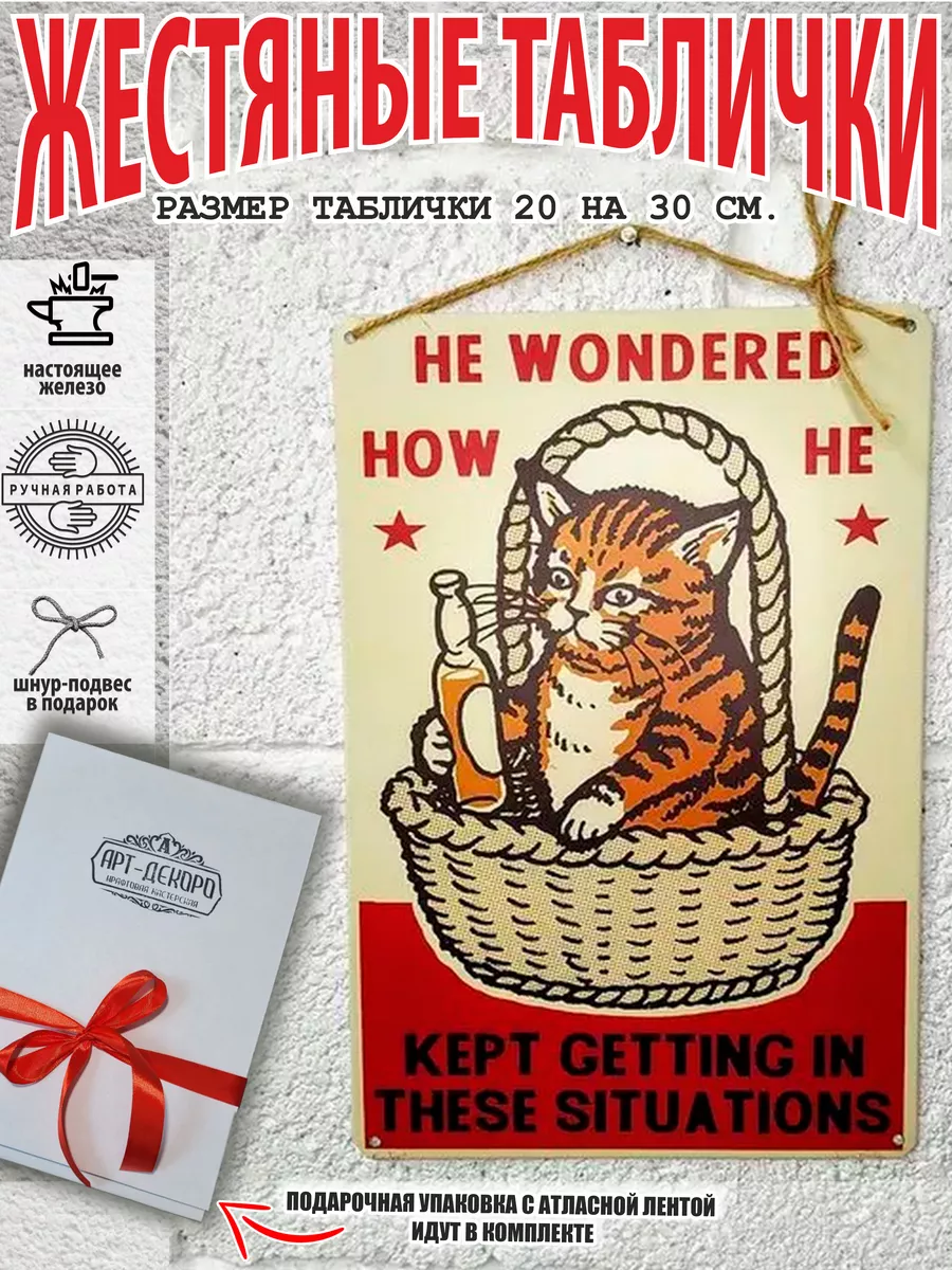 Он задавался вопросом, как он продолжал попадать в такие ситуации! — текст на картинке. Представляем вам стильные и эффектные жестяные таблички и картины, в том числе удивительные изображения котов на картинах художников. Все наши постеры, включая жестяные таблички, выполнены из высококачественного металла, обеспечивающего долговечность и устойчивость к солнечному свету. Размер 20×30 см позволяет легко интегрировать их в любой интерьер – будь то кухня, гостиная, офис или кафе.