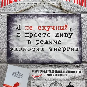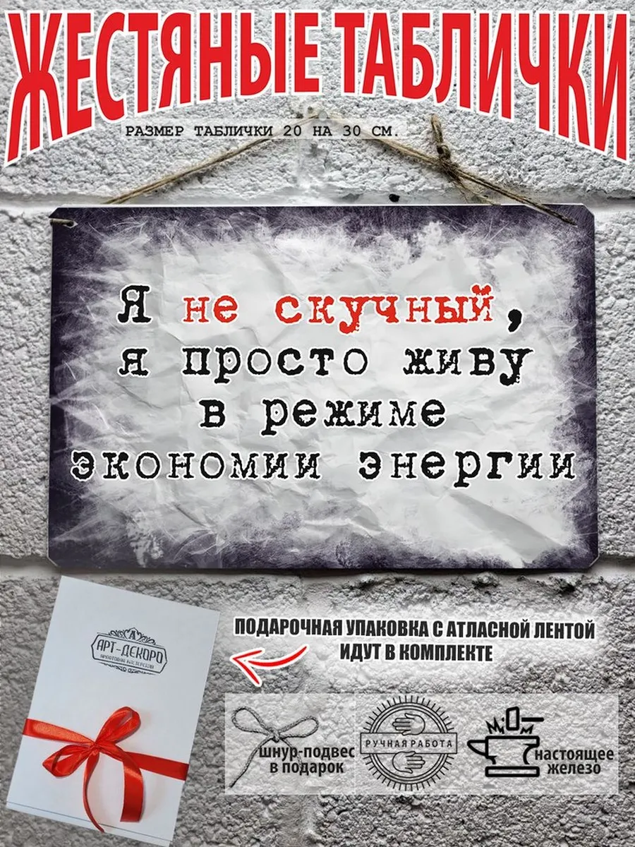 «Я не скучный я просто живу в режиме экономии энергии» Обратите внимание! У нас все таблички идут сериями, можно создать отличную композицию в одном стиле. Кроме того, таблички это стильный и недорогой подарок по любому поводу. Прикольные штуки железная табличка картинки мотиваторы позитивные и демотиваторы из 100% металла от нашего бренда будет прекрасным украшением для квартиры, дома, офиса, бара или кафе. Мотивация это прикол, часть нашей жизни, картина мотиватор всегда улучшает настроение. Сочетая в себе эстетику и прочность, декоративная металлические мотивационные карточки являются непременным элементом декора как для внутренних помещений, так и для уличных зон. Выберите из нашего широкого ассортимента аксессуар, который подойдет именно вам. Жестяная табличка Арт-Декоро крепится на саморезы, шурупы или на специальный шнур из натурального джута который идет в комплекте с каждым заказом как бесплатный подарок, что позволяет разнообразить способы использования. Плакаты с приколами можно повесить на стену в гостиной, спальне, кухне или на улице, чтобы создать атмосферу, которая отражает индивидуальность. Таблички можно мыть, они не выцветают долгие годы. Картина открытки постер плакат стикеры наклейки приколы мотивация все это сочетается в наших изделиях. Мы гордимся тем, что каждое изделие изготовлено из настоящего металла, краска наносится прямо на железо. Это гарантирует ее долговечность и надежность. Красивая и изысканная отделка обеспечивает эффектный внешний вид и придает обстановке особое очарование. Подарите возможность добавить изюминку в интерьер и превратите пространство в уникальное, а также уютное место, которое будет отличаться от всех остальных. В нашем магазине Вы найдёте большой выбор декора интерьера и создадите превосходную обстановку.