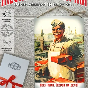СССР Железная жестяная табличка ручной работы, выполнена из 100% металла имеет классический размер 20*30 см. Края загнуты на 5 мм внутрь. Изображение наносится прямо на металл. Яркие насыщенные и объемные цвета. Можно использовать как в помещении, так и на улице она не боится влаги. Варианты крепления : на саморезы-шурупы, по углам имеются отверстия или на шнур-подвес из натурального джута, который идёт в подарок. Сделано в России. Упакована в прозрачный открывающийся пакет для защиты от царапин при транспортировке. Внешняя дополнительная эко-упаковка из картона, подходит для подарка. Плакат советский — отличный подарок и стильный декор любого интерьера. Сувенир советская агитация — хороший презент. Картинка советская пропаганда — это отличный декор любого интерьера. Табличка на стену портрет Сталин Ленин — украшение кухни, дома, офиса, кафе, кофейни. Картина советский союз этот ретро стиль который всегда в моде. Подарок начальнику, другу, винтажный ретро советский постер на жести. Декоративная жесть это картина для квартиры и дачи. Вся коллекция табличек с тематикой советские плакаты в нашем профиле в бренде СССР. Так же в нашем магазине более 15 000 видов табличек из разный коллекций, каждый найдет себе по душе! Добавляйте товар в избранное, что бы первыми узнавать о скидках и новинках