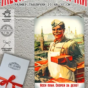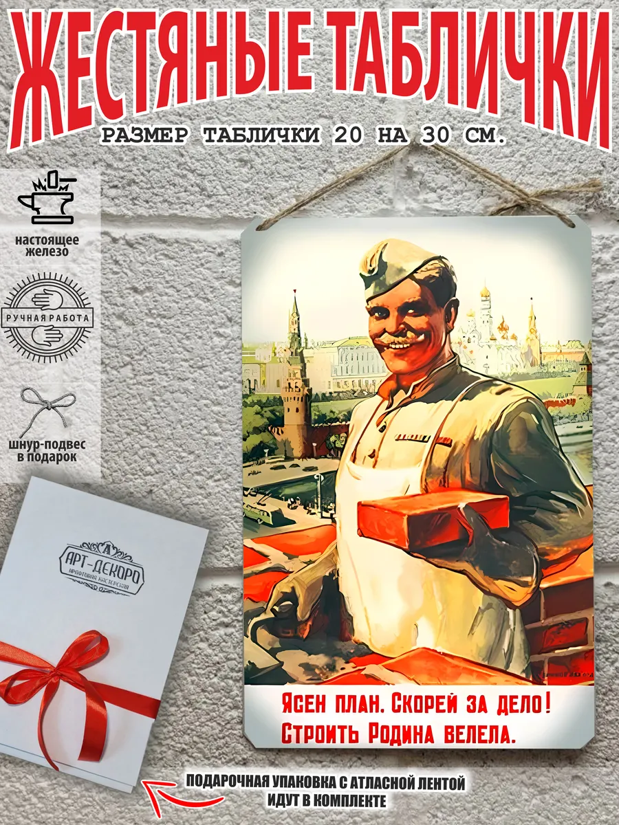 СССР Железная жестяная табличка ручной работы, выполнена из 100% металла имеет классический размер 20*30 см. Края загнуты на 5 мм внутрь. Изображение наносится прямо на металл. Яркие насыщенные и объемные цвета. Можно использовать как в помещении, так и на улице она не боится влаги. Варианты крепления : на саморезы-шурупы, по углам имеются отверстия или на шнур-подвес из натурального джута, который идёт в подарок. Сделано в России. Упакована в прозрачный открывающийся пакет для защиты от царапин при транспортировке. Внешняя дополнительная эко-упаковка из картона, подходит для подарка. Плакат советский — отличный подарок и стильный декор любого интерьера. Сувенир советская агитация — хороший презент. Картинка советская пропаганда — это отличный декор любого интерьера. Табличка на стену портрет Сталин Ленин — украшение кухни, дома, офиса, кафе, кофейни. Картина советский союз этот ретро стиль который всегда в моде. Подарок начальнику, другу, винтажный ретро советский постер на жести. Декоративная жесть это картина для квартиры и дачи. Вся коллекция табличек с тематикой советские плакаты в нашем профиле в бренде СССР. Так же в нашем магазине более 15 000 видов табличек из разный коллекций, каждый найдет себе по душе! Добавляйте товар в избранное, что бы первыми узнавать о скидках и новинках