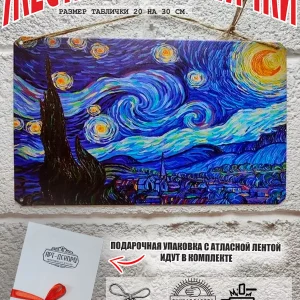 Представляем вам стильные и эффектные жестяные таблички с изображением репродукций Винсента Ван Гога. Наши постеры — жестяные таблички в стиле постимпрессионизм, выполнены из металла, который отличается высоким качеством и долговечностью. Размер 20×30 см позволяет легко вписать наши картины в любой интерьер, будь то кухня, гостиная, офис или кафе. Почему стоит выбрать наш постер для интерьера? Яркие и насыщенные цвета не выгорают на солнце и делают ваше пространство выразительным и уникальным. Легкость в уходе: наши картины для интерьера, таблички на дверь и постеры на стену можно легко мыть. Они не боятся влаги, что позволяет использовать их как в помещениях, так и на улице. Удобные варианты крепления: табличка может быть установлена на саморезы, гвозди, кнопки, клейкую ленту, магниты или повешена на шнур из натурального джута, который идет в комплекте. Упаковка: каждая табличка автопортрет ван гог аккуратно упакована в защитный пакет и дополнительно завернута в эко-картон, а также дополнительно в комплекте идет подарочная упаковка, атласная лента и открытка — что делает её отличным подарком на любой случай – от дня рождения до новоселья – готовый подарок. Мы гордимся тем, что предлагаем более 15 000 уникальных дизайнов, включая постеры на стену ирисы, череп с горящей сигаретой, подсолнухи, цветущие ветки миндаля, на пороге вечности, ваза с ирисами, ваза с розами, полуденный отдых, луг в горах, звездная ночь, вечерний пейзаж, оливковые деревья, ваза с подсолнухами, вид поля с ирисами, сад в арле вангог, для интерьера, постер на заказ и прикольные металлические таблички, чтобы каждый мог найти что-то для себя. Наши постеры разделены на коллекции разных серий, что позволяет заказать несколько табличек в едином стиле и создать неповторимую композицию у вас дома, не упустите возможность сделать свой дом стильным – добавляйте товары в избранное, чтобы первыми узнавать о скидках и новинках! Создайте атмосферу уюта и стиля с нашими металлическими картинами и постерами для интерьера уже сегодня!